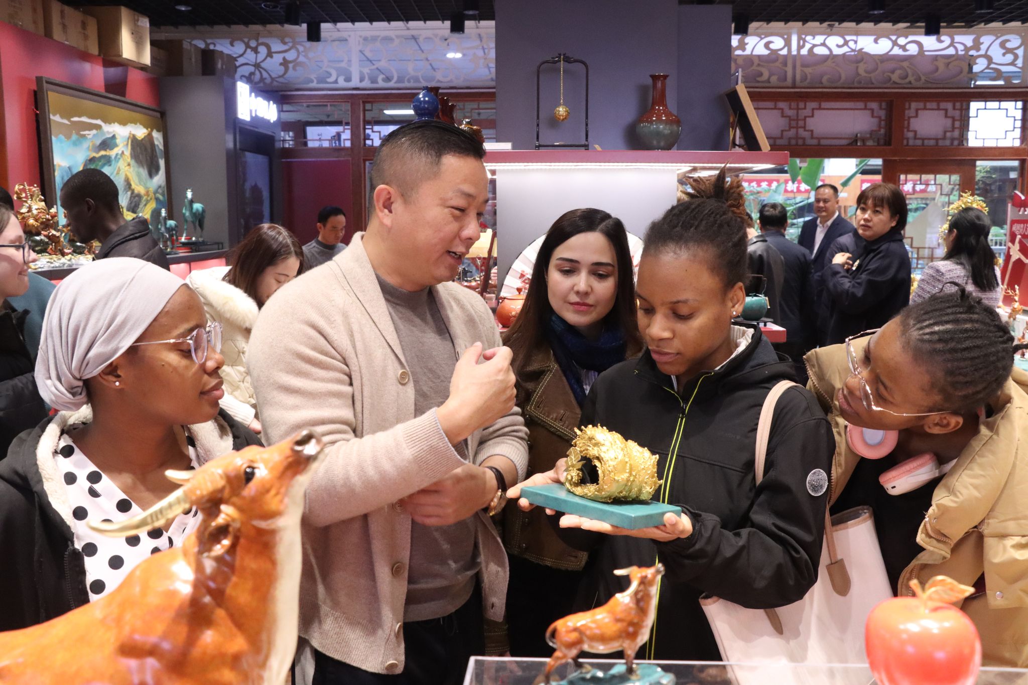 张庆国书记一行人参观集团标志性建筑,了解广友集团企业文化及发展历程,为国际学生建立茶产业的宏观认知;访问创虹茶业展示区,欣赏国家级非遗“铜雕技艺”代表性传承人朱炳仁先生的艺术作品,感受传统工艺与茶文化的融合之美;参观六妙白茶博物馆,聆听工作人员讲解国家级非物质文化遗产“福鼎白茶”的传统制作技艺、历史传承及产品特质,深化对中国名茶的认知;走进济南1953·茶文化创意产业园,实地考察茶产业与文化创意产业融合发展的实践成果,了解茶文化创新传播的多元路径;观赏专业茶艺表演,深入了解茶道礼仪、泡茶技艺的细节规范,亲自动手实践泡茶流程,沉浸式感受中国茶艺的礼仪内涵与文化底蕴。