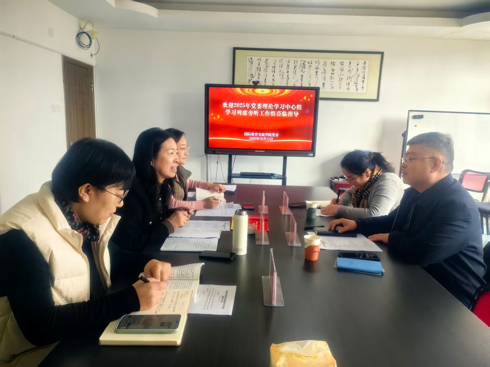 督导组成员、学校党委巡察工作领导小组办公室主任丁立波对学院党委理论学习中心组学习表示充分肯定,他指出,党委理论学习中心组学习的政治属性是其最根本、最核心的属性,其首要任务是通过学习习近平新时代中国特色社会主义思想等党的创新理论,加强领导班子和领导干部的政治建设,确保在思想上政治上行动上同党中央保持高度一致。国际教育交流学院党委要不断丰富理论学习形式和载体,提升学习成效,推动学校来华留学教育取得新成效。